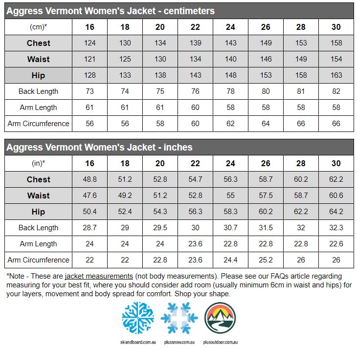 Size chart for Vermont Plus Size Snow Jacket Black Sizes 16-30