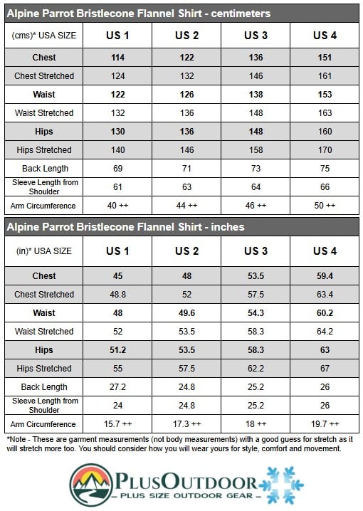Size chart for Alpine Parrot Bristlecone Flannel Womens Shirt Dessert Red Plus Size 3