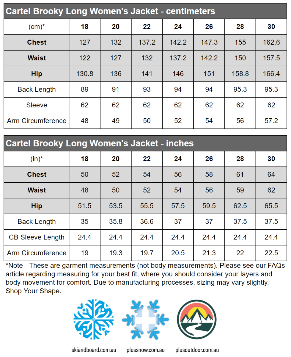 These measurements are garment (not body) measurements. Do not order based on your usual size as sizes vary greatly between styles. We recommend adding room for layering, comfort and movement.
