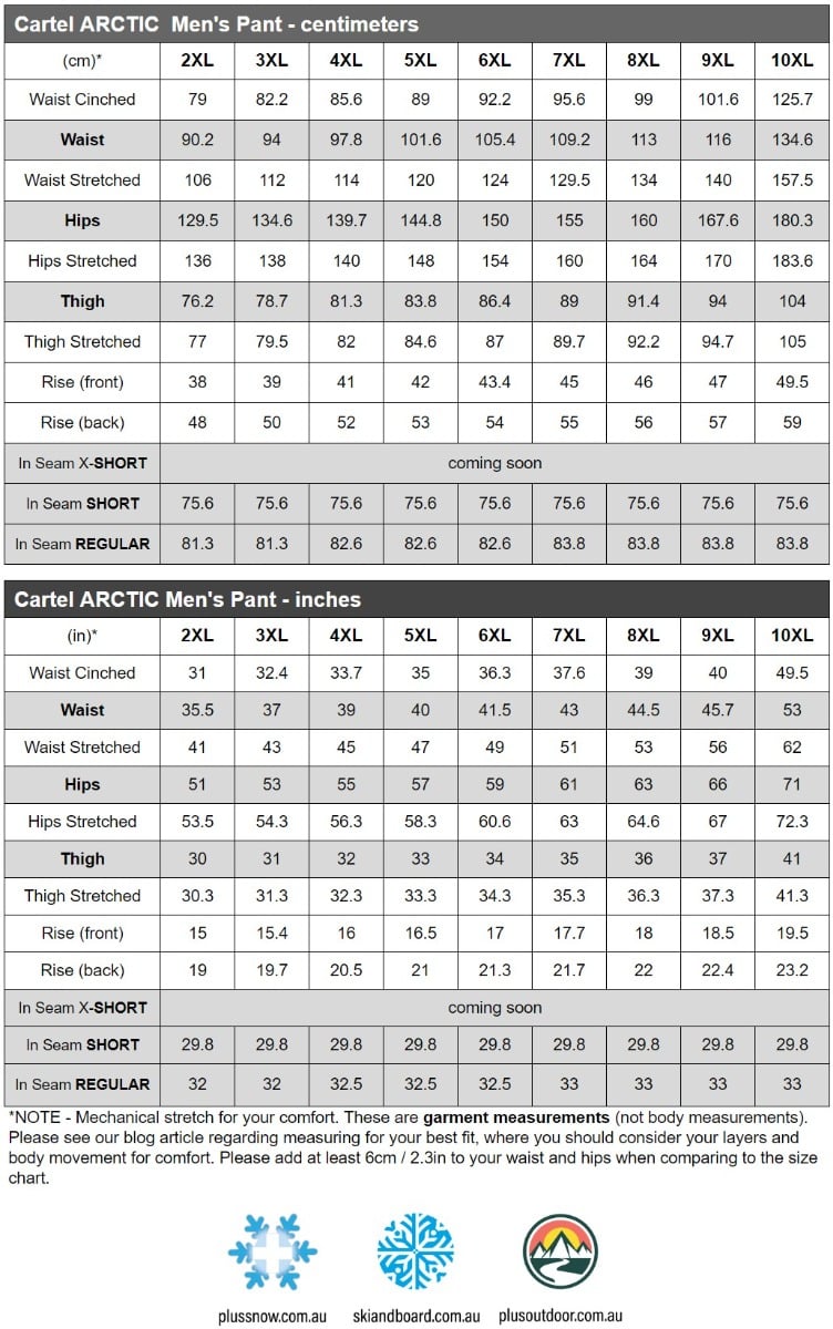 Size chart for Cartel Arctic Stretch Mens Ski Pants Army Short & Regular 3XL-8XL