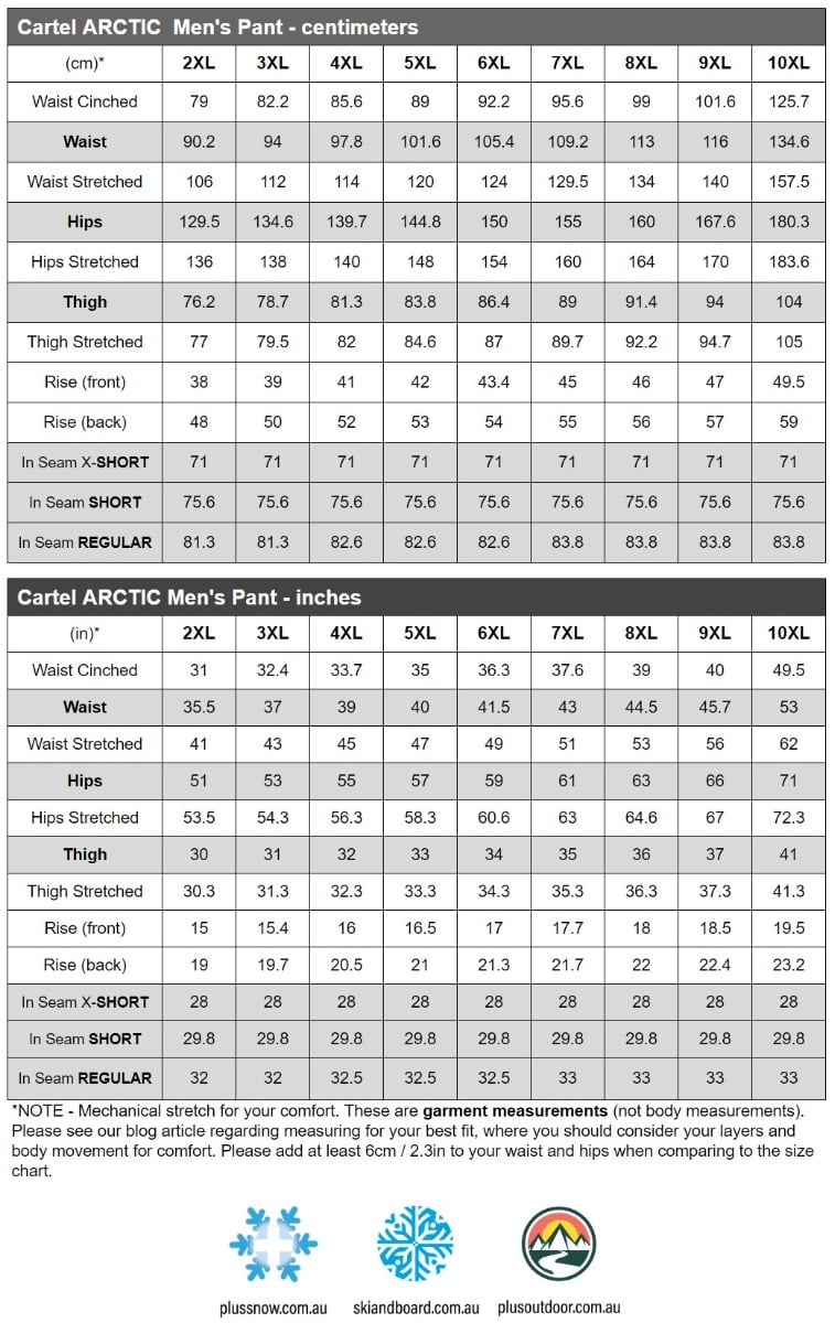 Size chart for CLEARANCE - Cartel Arctic Stretch Unisex Snow Pant Cherry Ripe Size 2XL