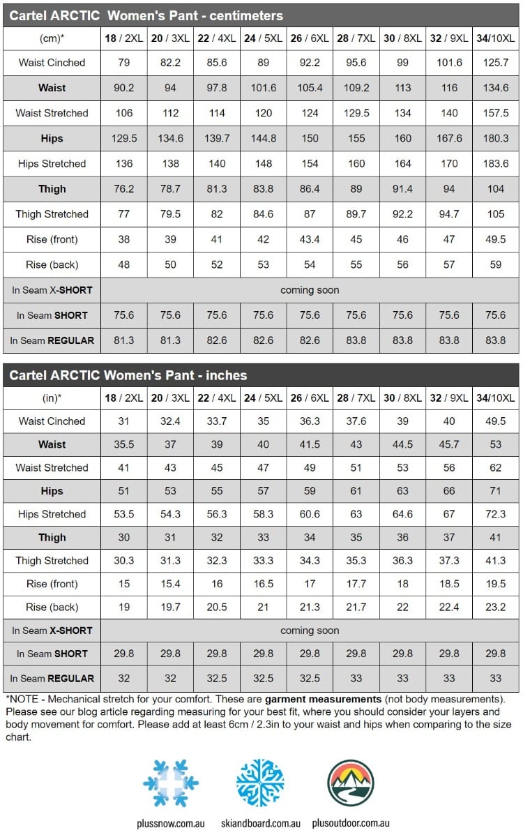 Size chart for Cartel Arctic Stretch Womens Ski Pants Army Plus Sizes 3XL-8XL
