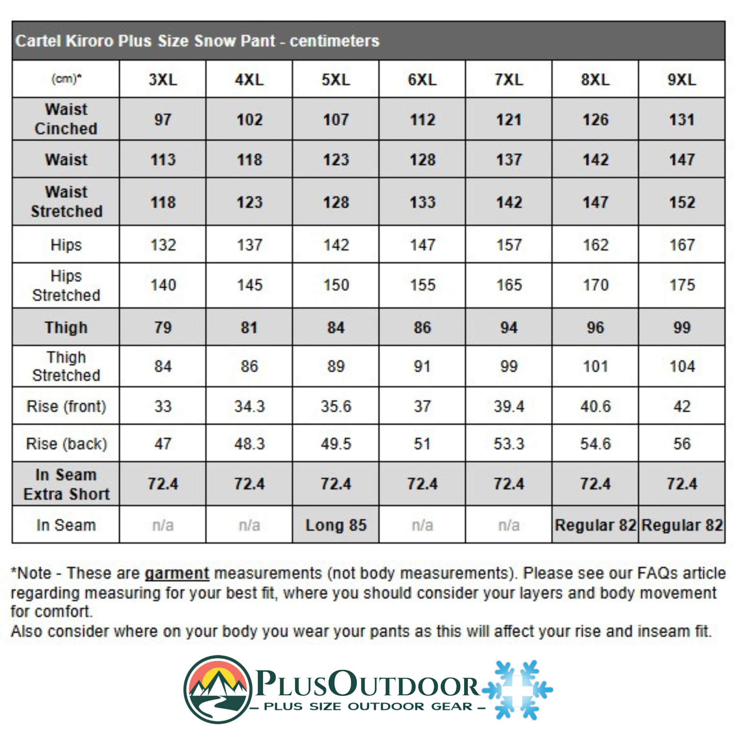 Size chart for Cartel Kiroro Stretch Plus Size Snow Pants Black Unisex 3XL-9XL
