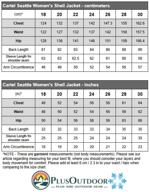 Size chart for CLEARANCE - Cartel Seattle Stretch Shell Jacket Army Green Plus Size 18