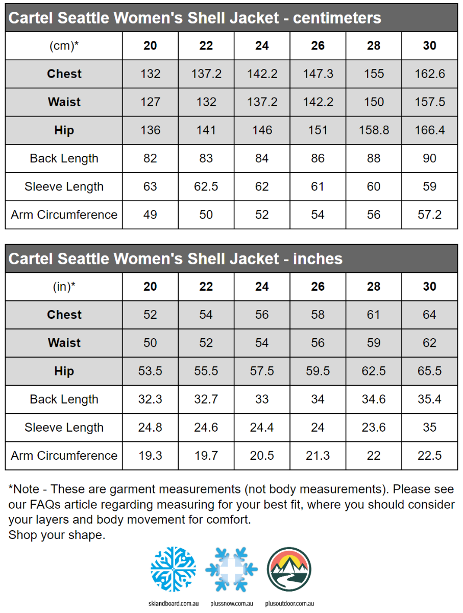 Size chart for Cartel Seattle Stretch Shell Jacket Cherry Ripe Womens Plus Size 20