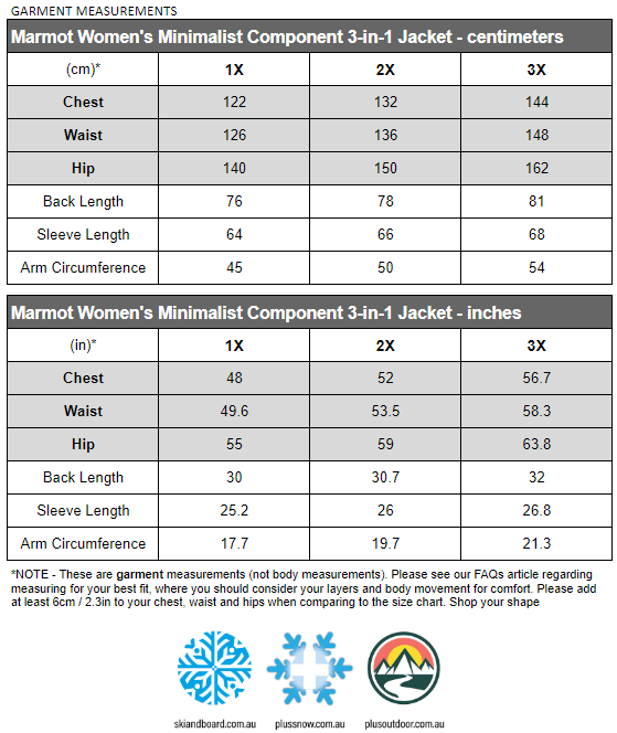 Size chart for Marmot Minimalist Goretex Component 3in1 Women's Jacket Purple Size USA 1X