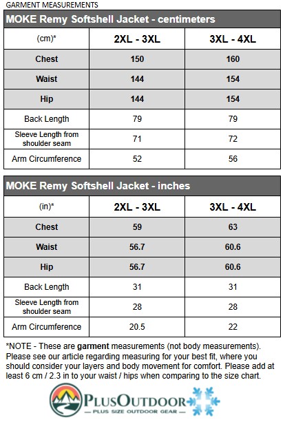 Size chart for Moke Remy Mens Plus Size Softshell Jacket Black 2XL-4XL