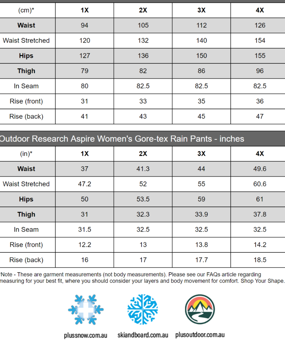 Size chart for Outdoor Research Aspire Goretex Women's Plus Size Rain Shell Pants Black Size USA 4X