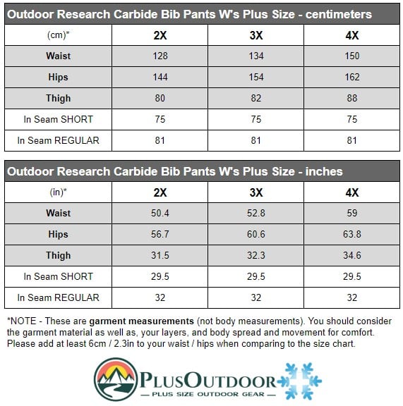 Size chart for Outdoor Research Carbide Women's Plus Size Bibs Shell Pants Black Sizes 2X-4X