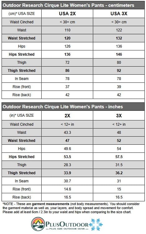 Size chart for Outdoor Research Cirque Lite Women's Softshell Pants Plus Size USA 2X-3X