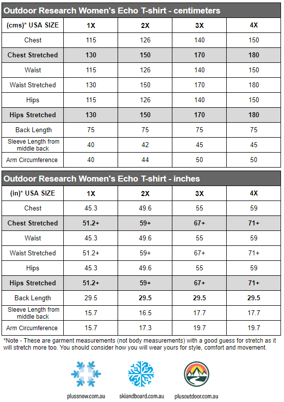 Size chart for Pre-Order: Outdoor Research Echo Womens Plus Size T-Shirt Sunrise 2X - 4X