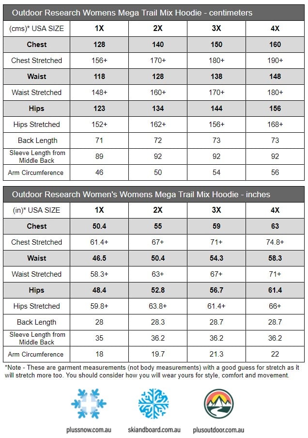 Size chart for Outdoor Research Mega Trail Mix Womens Plus Size Full Zip Fleece Topaz USA 1X-2X