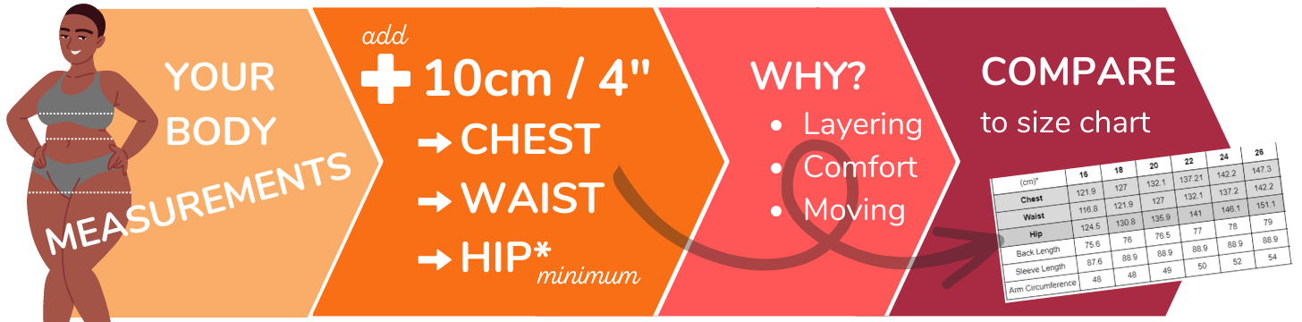 These measurements are garment (not body) measurements. Do not order based on your usual size as sizes vary greatly between styles. We recommend adding room for layering, comfort and movement.
