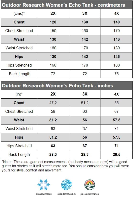 Size chart for CLEARANCE - Outdoor Research Echo Womens Plus Size Tank Top USA size 2X
