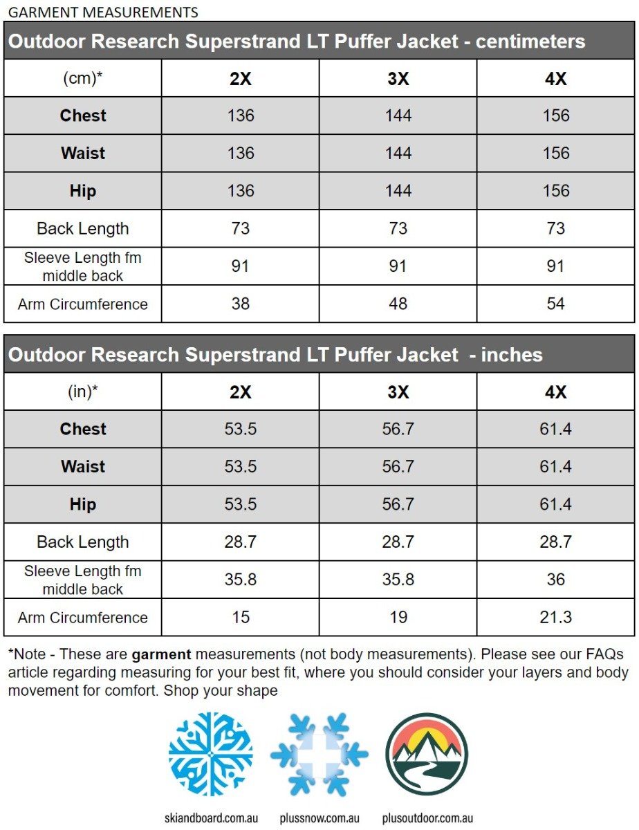 Size chart for Outdoor Research Womens Plus Size SuperStrand LT Hoodie Pink 2X-4X