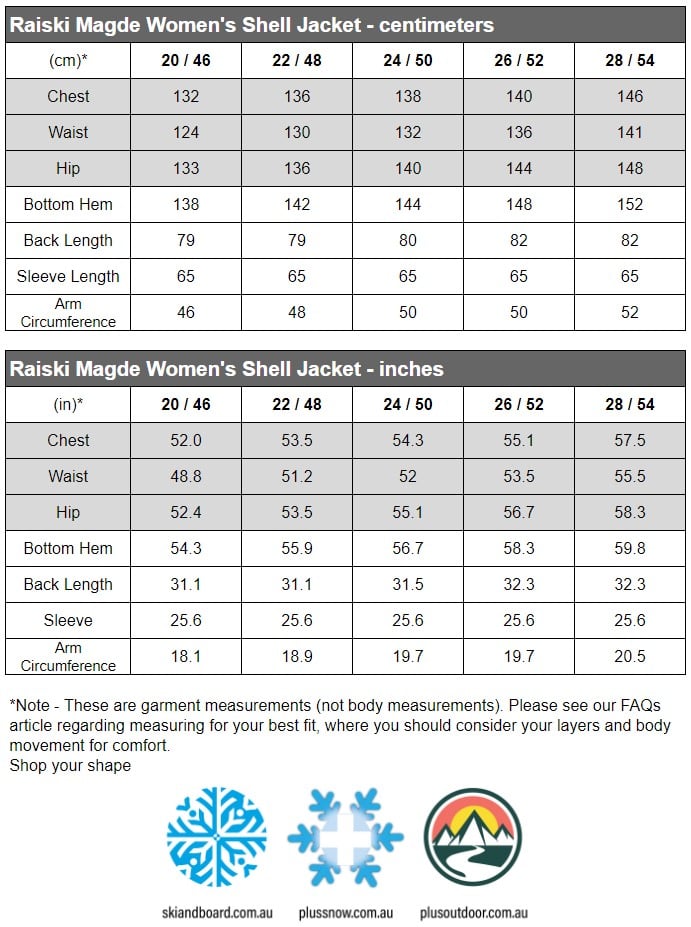 These measurements are garment (not body) measurements. Do not order based on your usual size as sizes vary greatly between styles. We recommend adding room for layering, comfort and movement.
