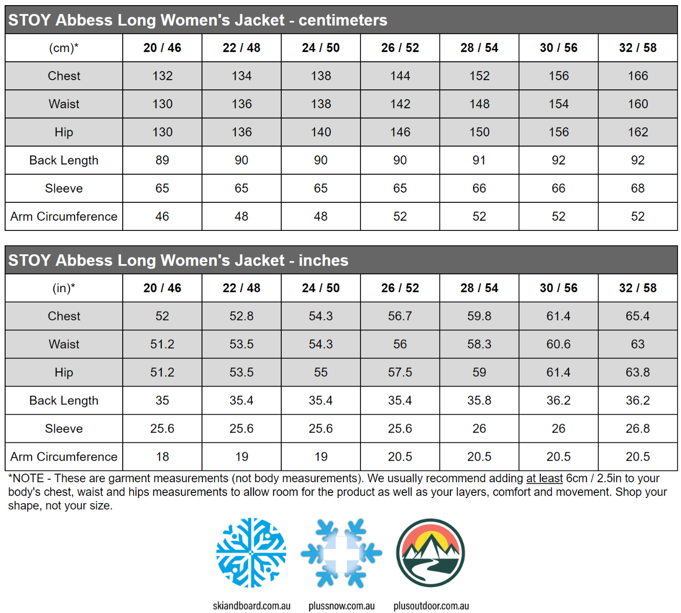 These measurements are garment (not body) measurements. Do not order based on your usual size as sizes vary greatly between styles. We recommend adding room for layering, comfort and movement.
