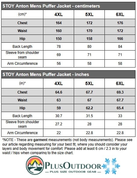 Size chart for Pre-Order: Stoy Anton Men's Plus Size Winter Puffer Coat Black Sizes 3XL - 6XL
