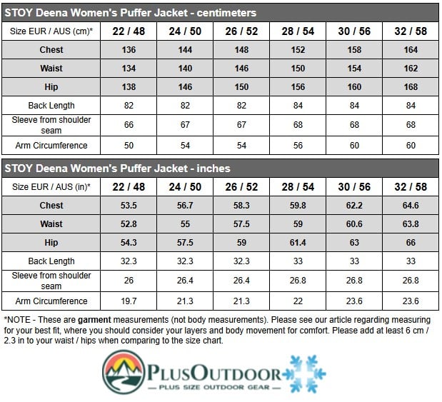 Size chart for STOY Deena Women’s Puffer Jacket Black Plus Sizes 20-24