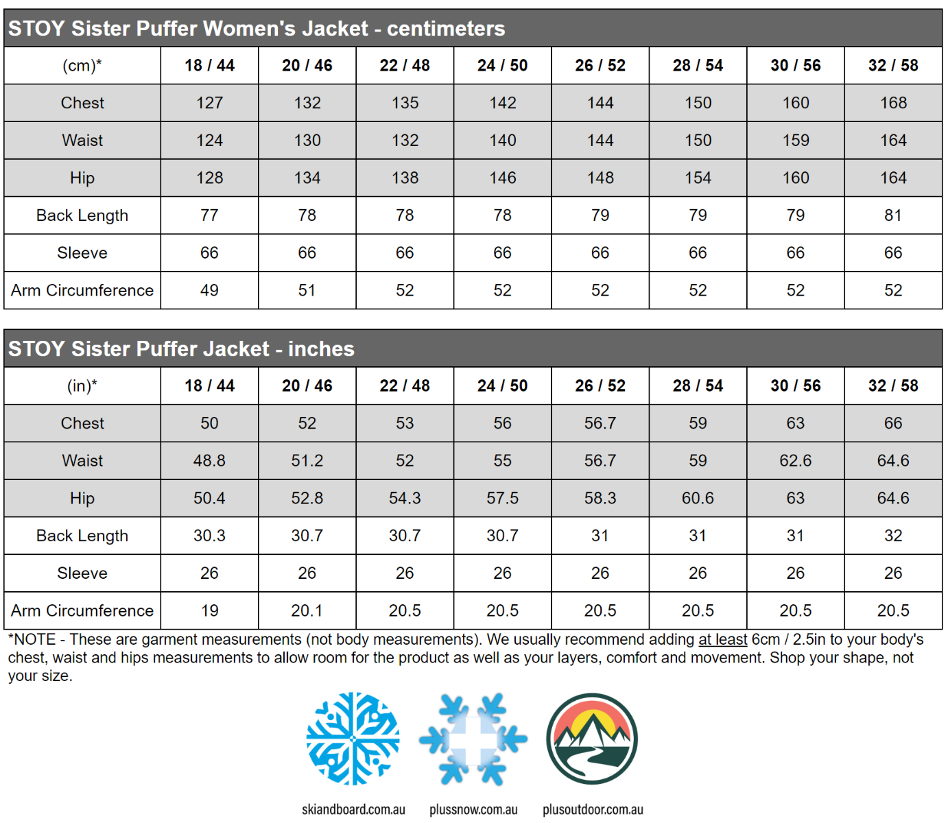 These measurements are garment (not body) measurements. Do not order based on your usual size as sizes vary greatly between styles. We recommend adding room for layering, comfort and movement.