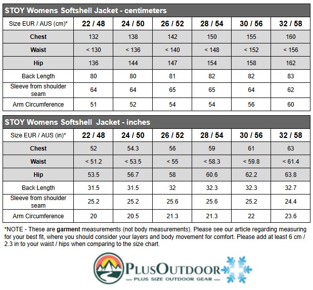 Size chart for Stoy Womens Plus Size Softshell Jacket Black Sizes 22 & 30