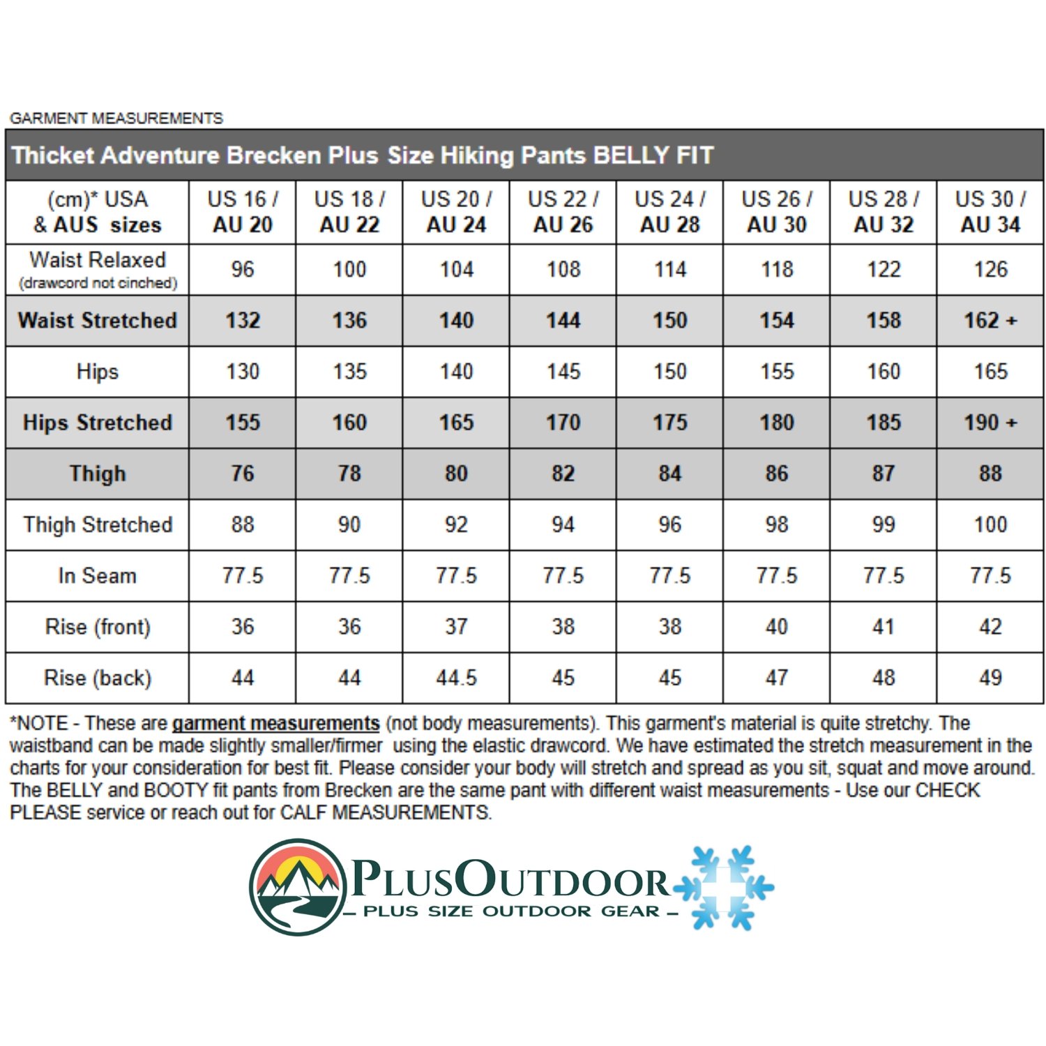Size chart for Pre-Order: Thicket Adventure Brecken Hiking Pants BELLY FIT Blue Plus Sizes 20 - 24