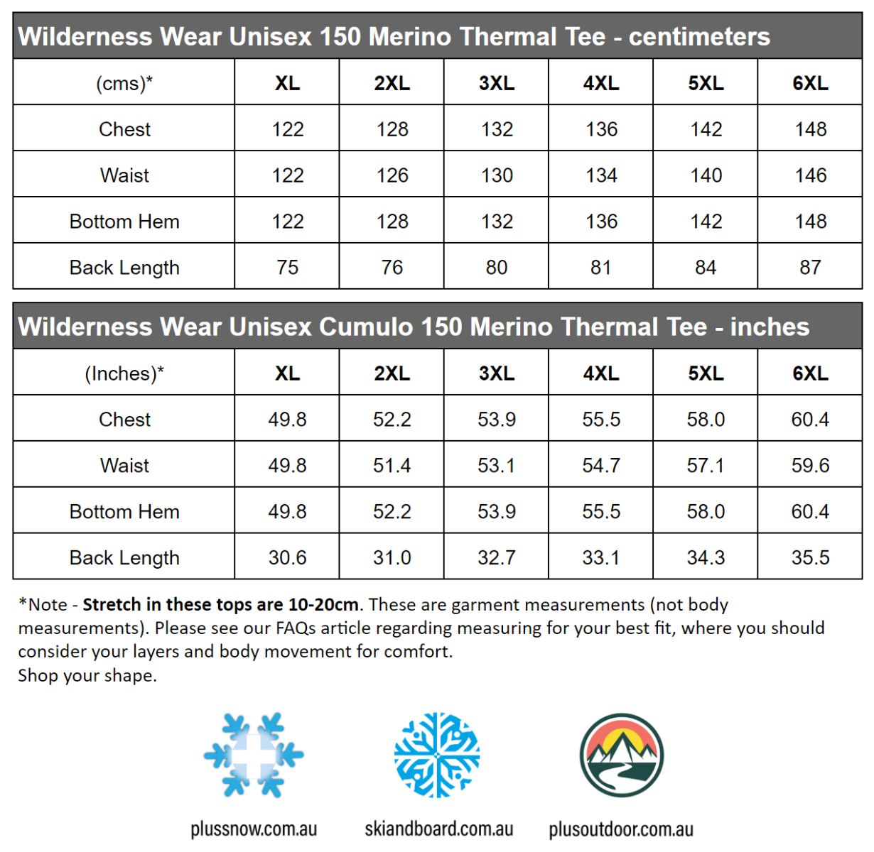Size chart for Wilderness Wear Unisex Plus Size Light Merino 170 T-Shirt XL-6XL