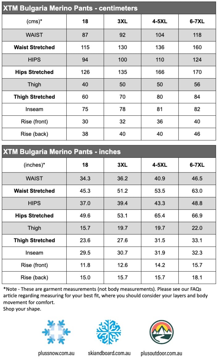 Size chart for XTM Bulgaria Merino Wool Plus Size Thermal Pants Burgundy Size 6-7XL