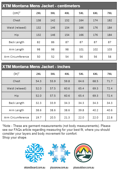 Size chart for XTM Montana Mens Plus Size Ski Jacket Winter Moss Sizes 2XL - 3XL