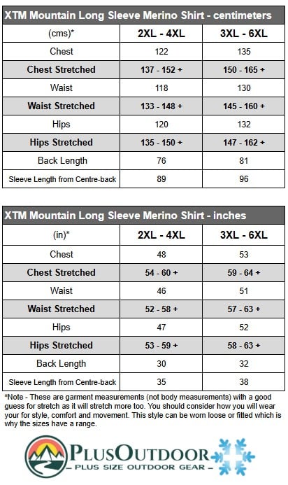 Size chart for XTM Mountain Merino Wool Men’s Long Sleeve Shirt Moss Size 3XL-6XL