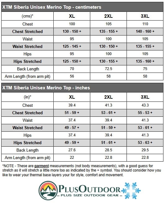 Size chart for XTM Siberia Merino Wool Unisex Plus Size Thermal Top Grey XL-3XL