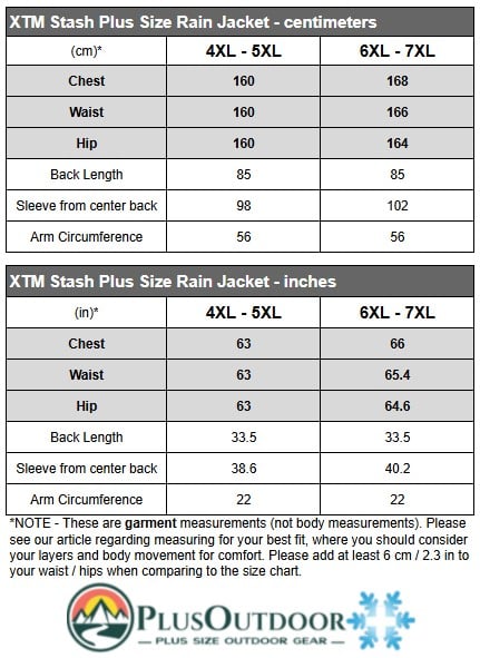 Size chart for XTM Stash Unisex Plus Size RAIN Jacket Black 4XL-7XL