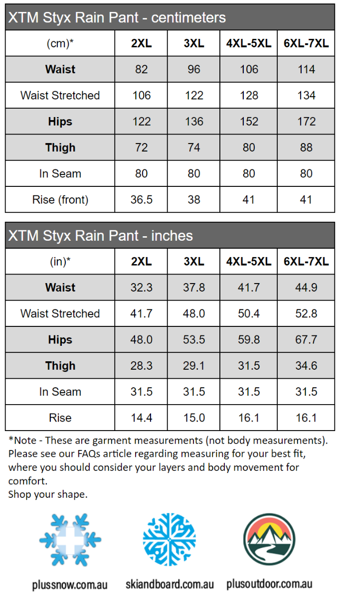 Size chart for XTM Styx Shell Rain Pants Unisex Plus Size 3XL - 5XL