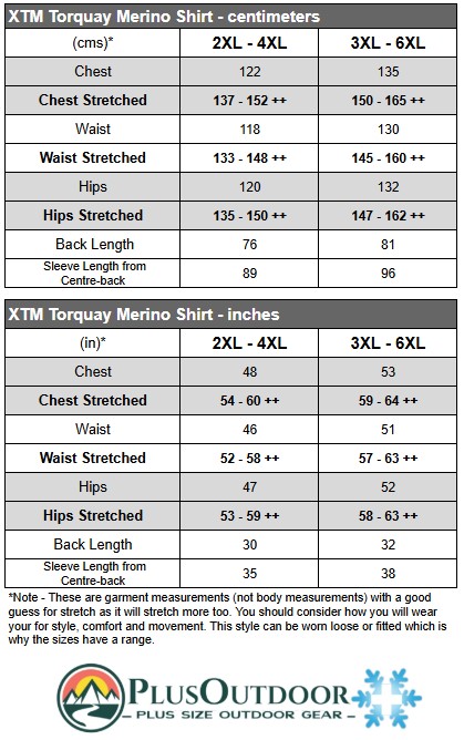 Size chart for XTM Torquay Merino Wool Unisex T-Shirt Black Size 2XL - 4XL