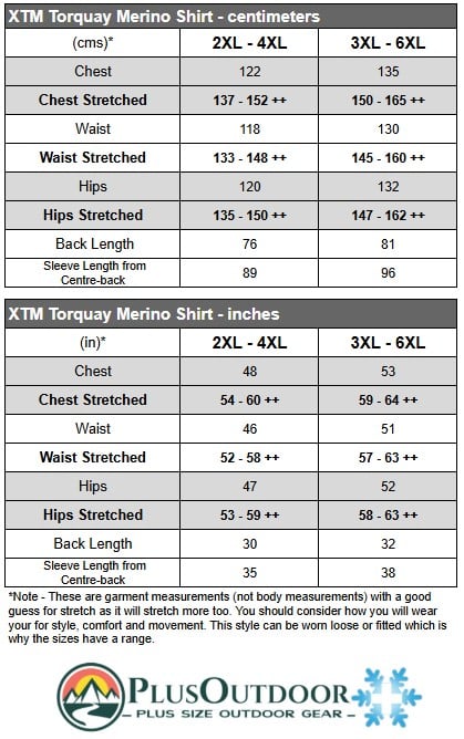 Size chart for XTM Torquay Merino Wool Unisex T-Shirt Moss Size 3XL - 6XL